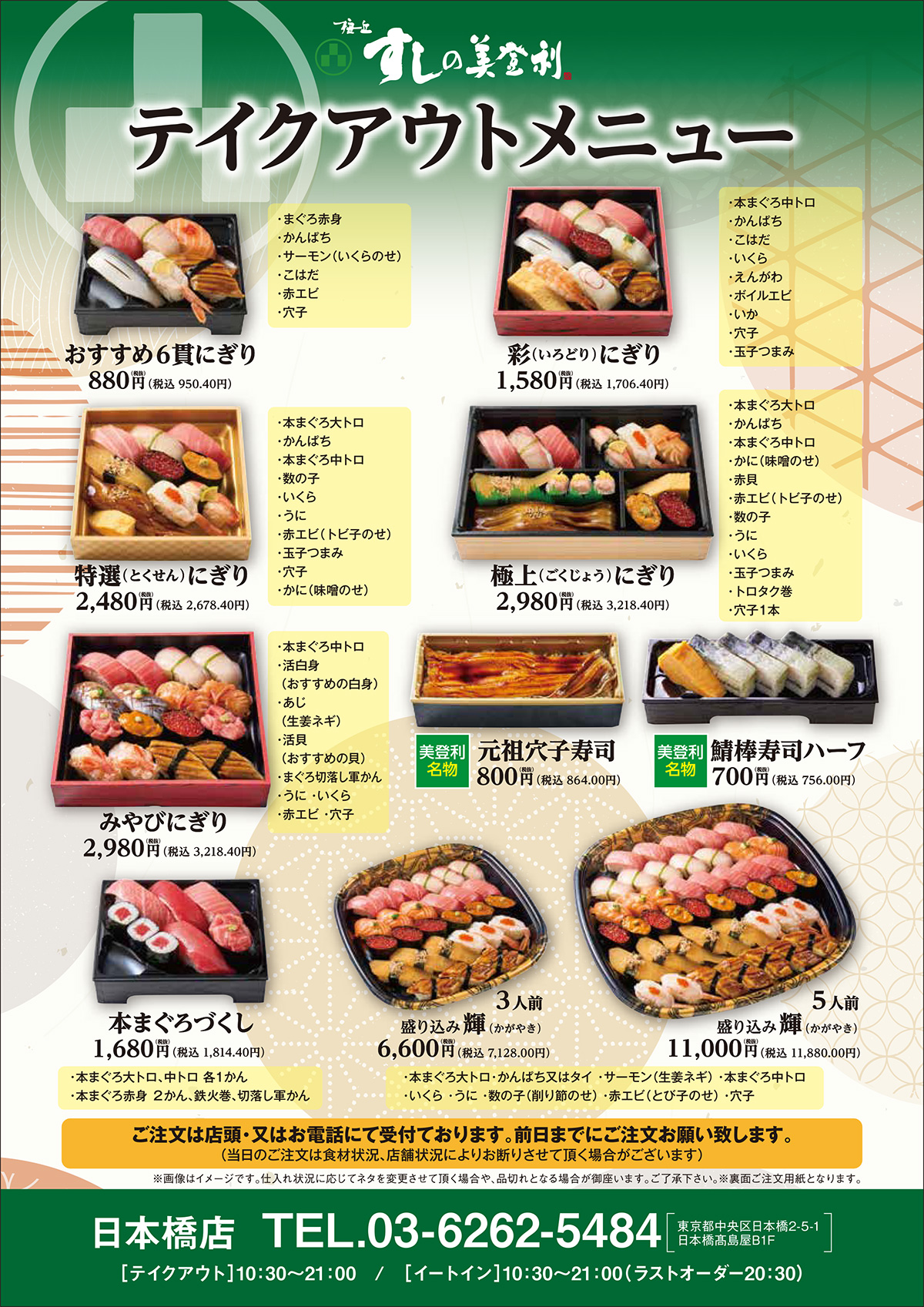 〒103-6190 東京都中央区日本橋2-5-1日本橋髙島屋S.C.新館 地下1階【営業時間】■テイクアウト 10:30~21:00 ■立ち食い 10:30~ラストオーダー/20:30